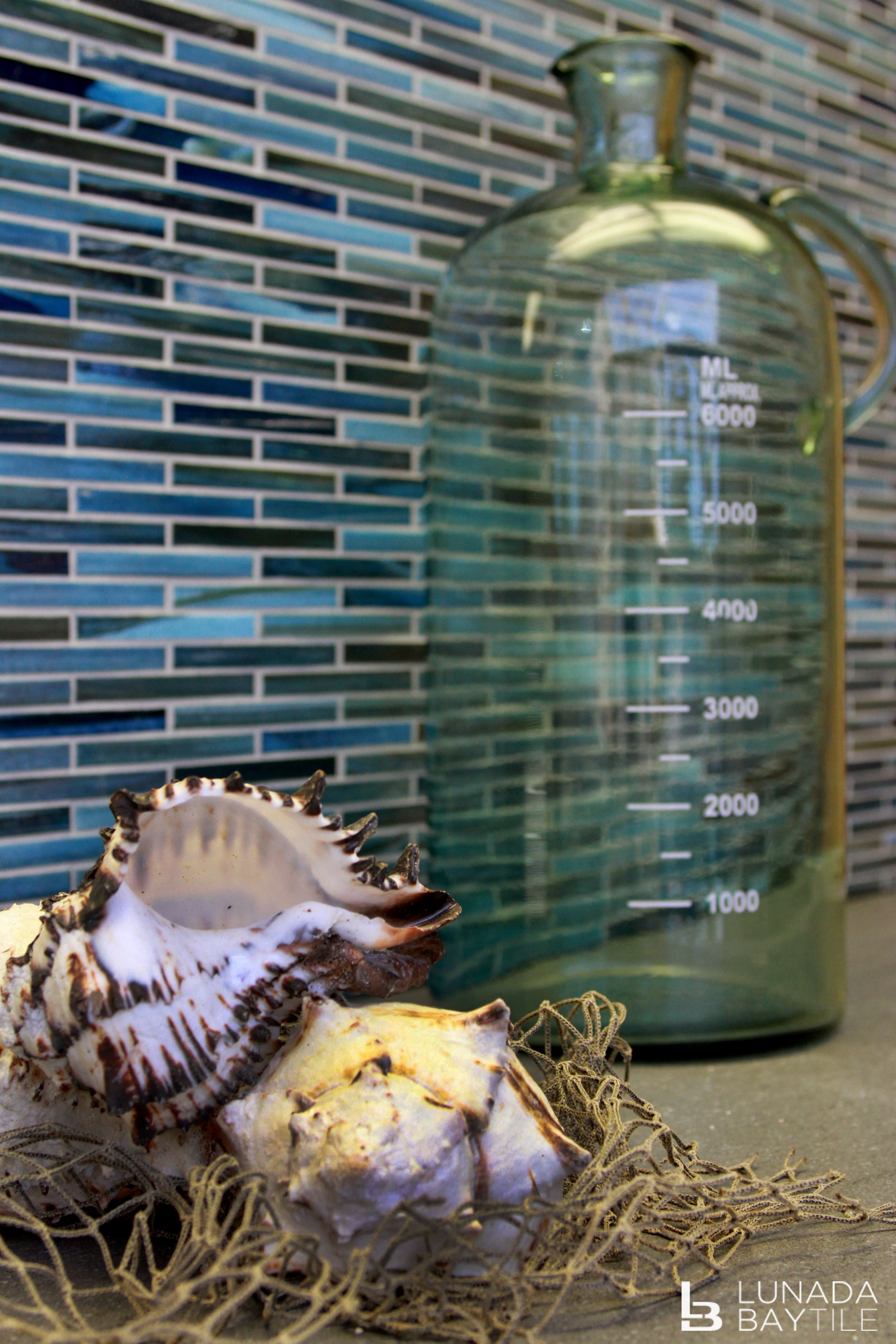 Agate 1/2x4 Portofino Pearl & Glass Bar liner in Cayman Blue Natural accent wall