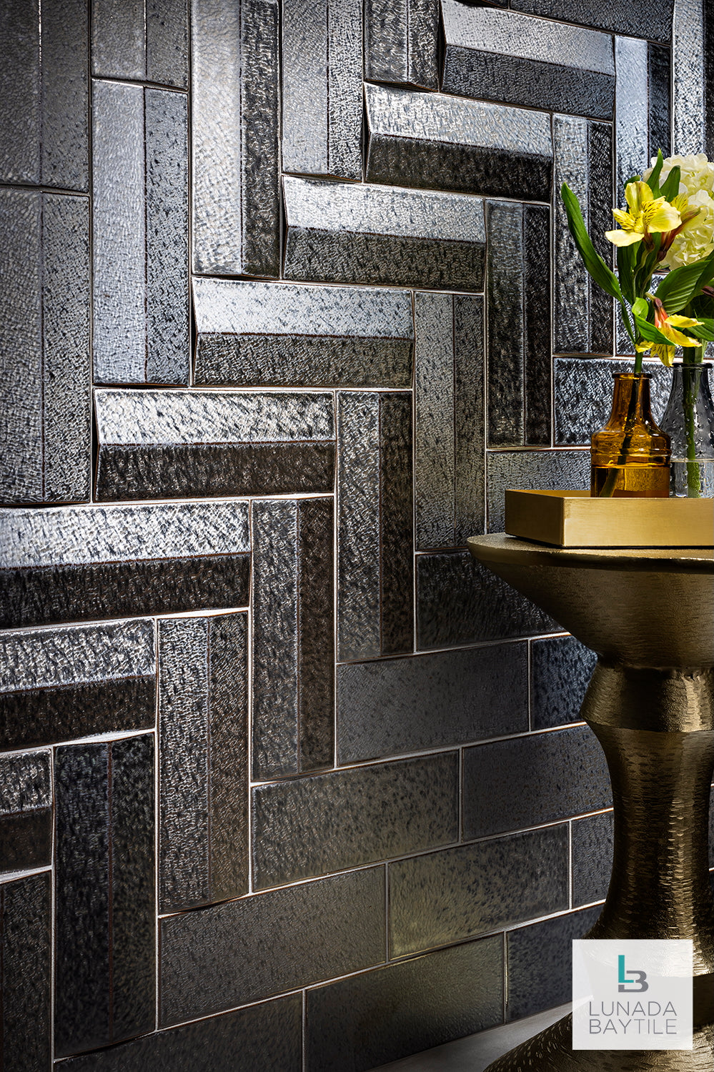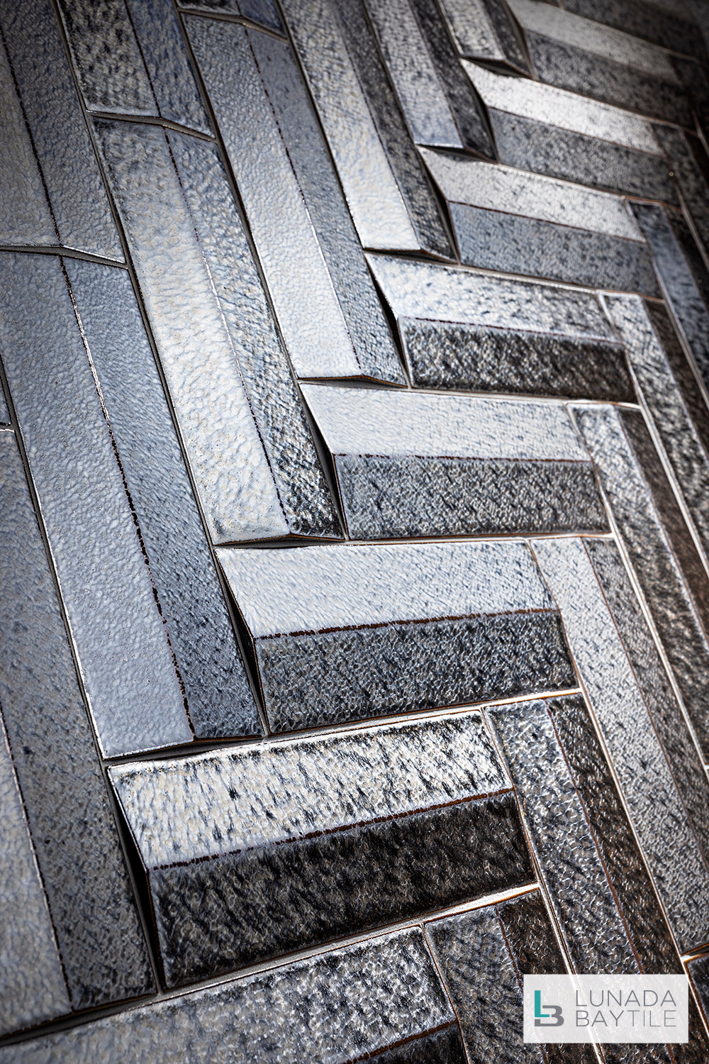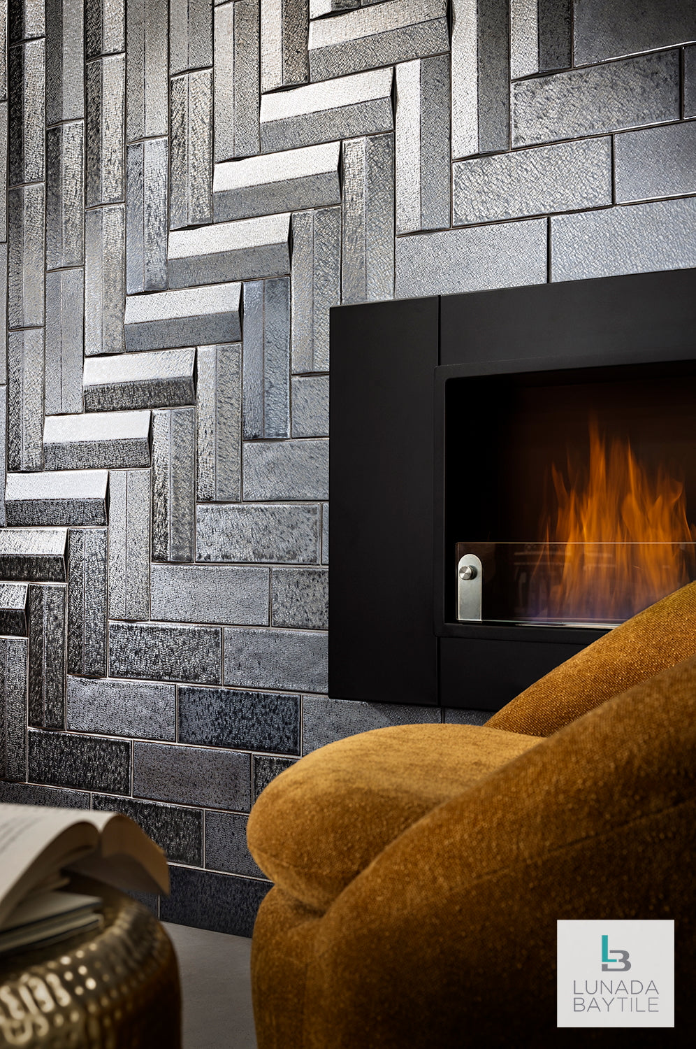Amazing vibe in this space through the dynamic arrangement of dimensional and serene handcrafted, ceramic tiles surrounding this fireplace.