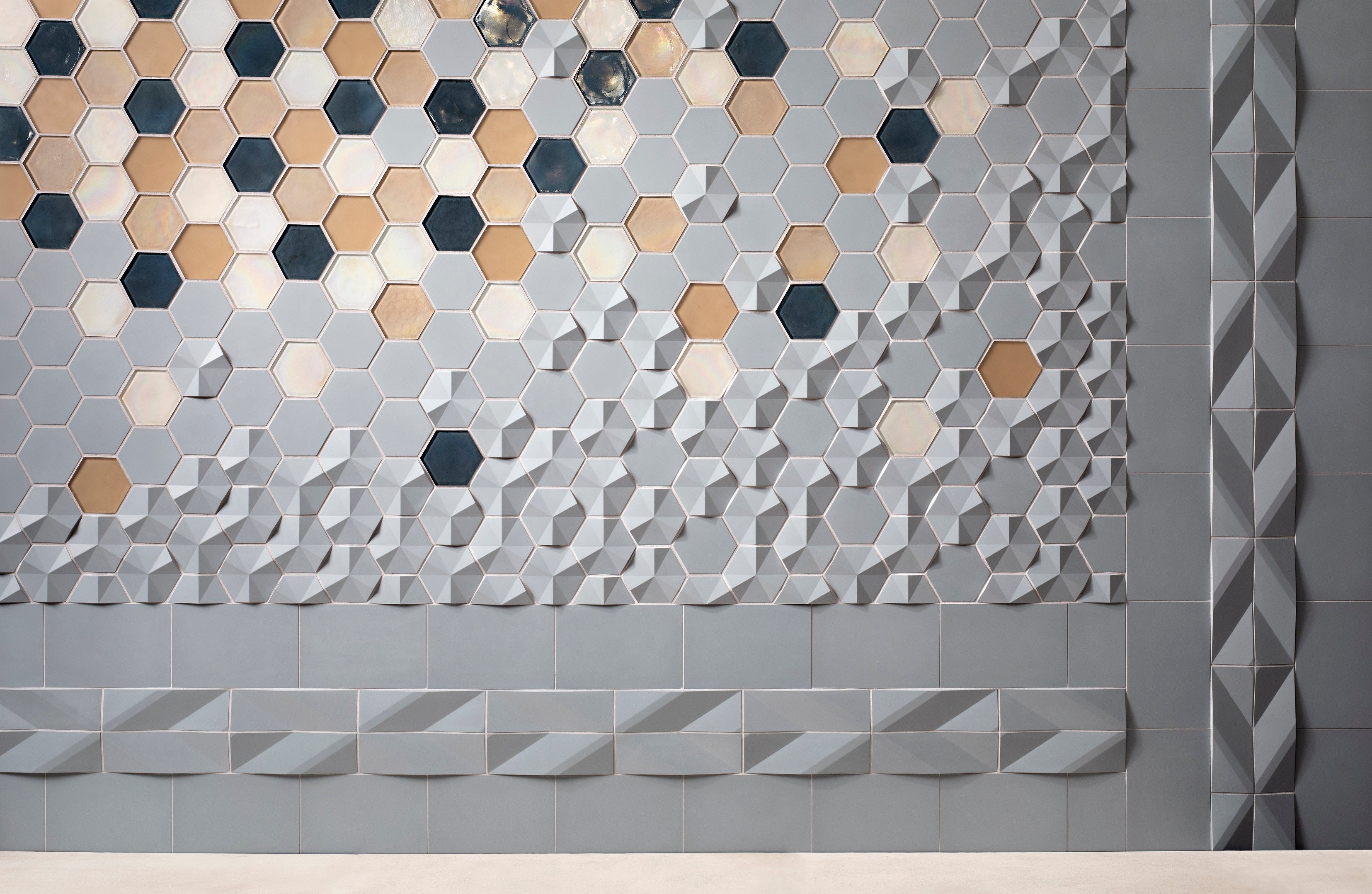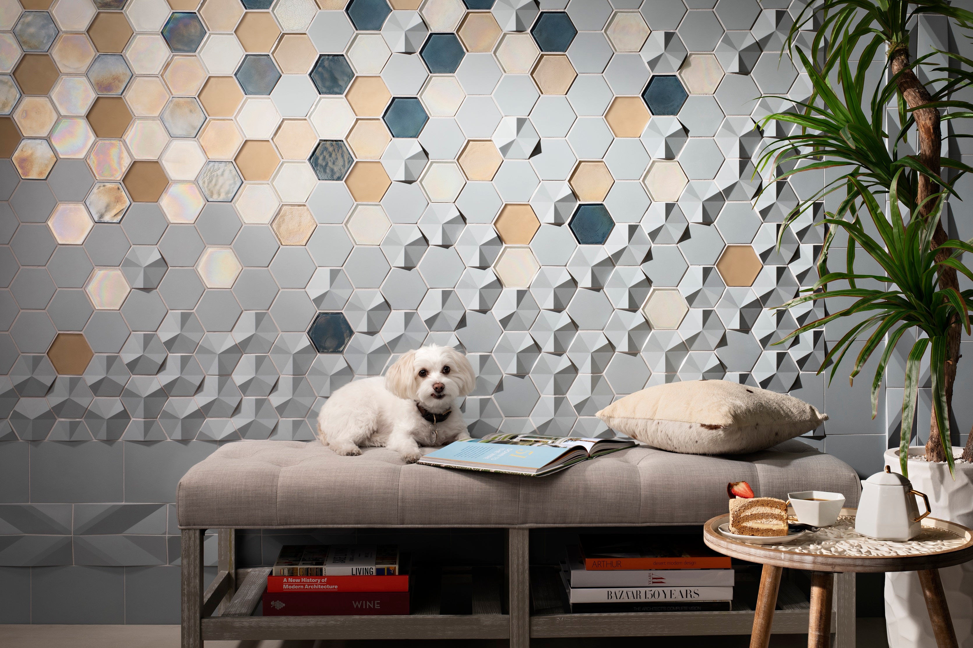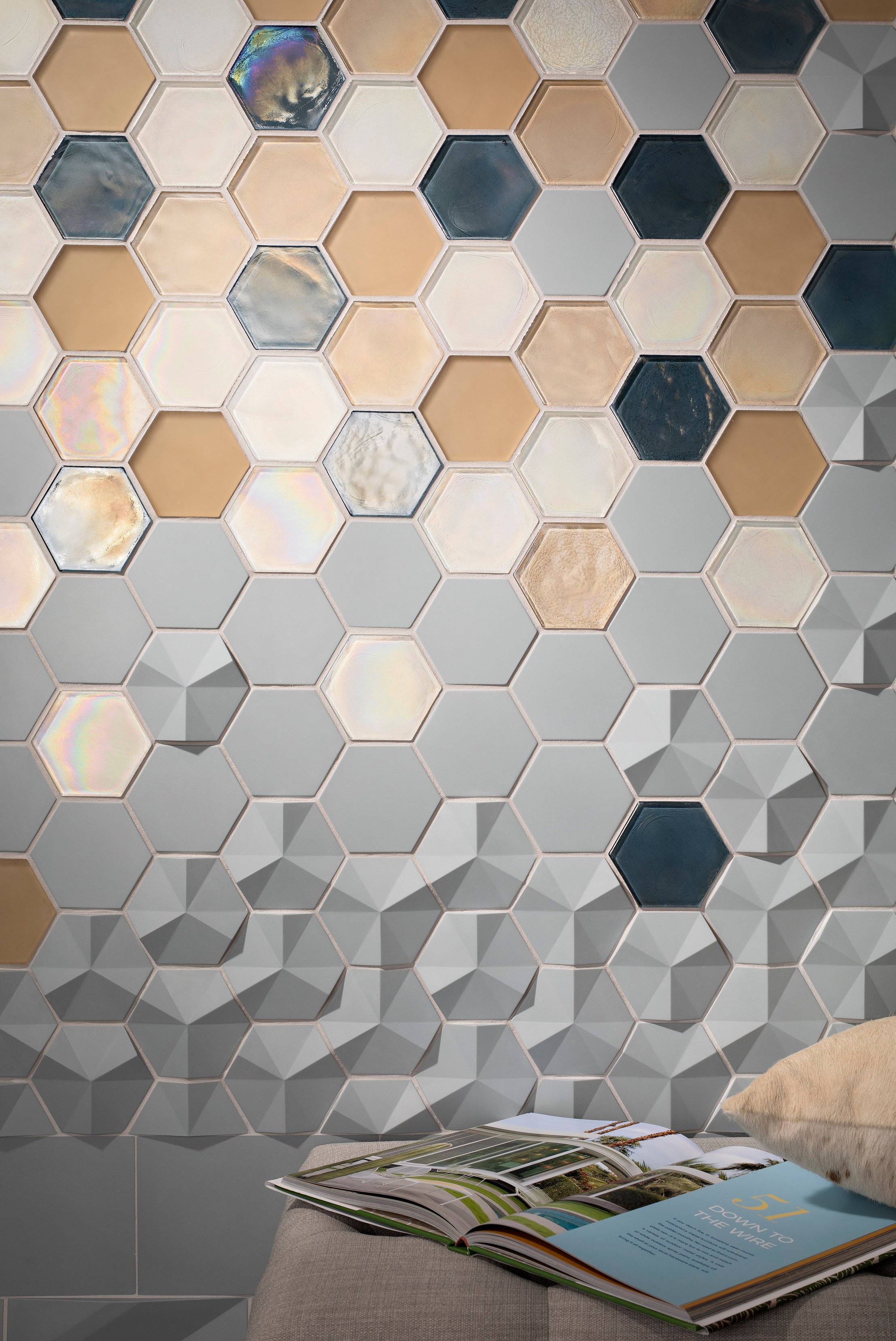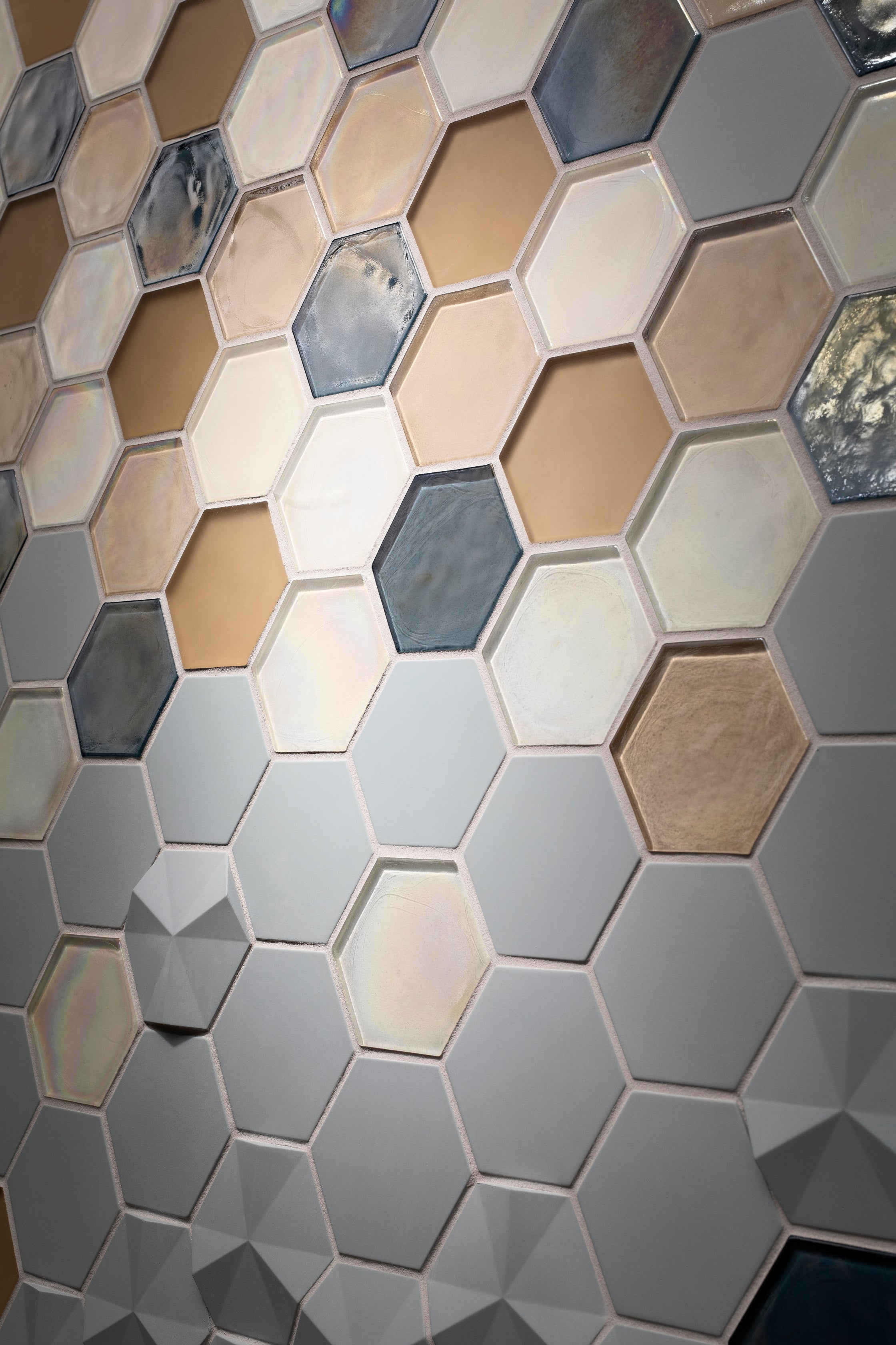 The mixed-media blend of textures and finishes is created by two types of materials. Concrete hexagons are Contourz Fanfare Hex & 4” Hex in Urban Mist. Glass hexagons are Flux 4” Hex in Cottage Blue Pearl, Crystal Pearl, and Latte in both Pearl and Silk finishes. The field tiles surrounding this multi-color/material panel is Contourz 6x9 and Zen Break A & B, also in Urban Mist.