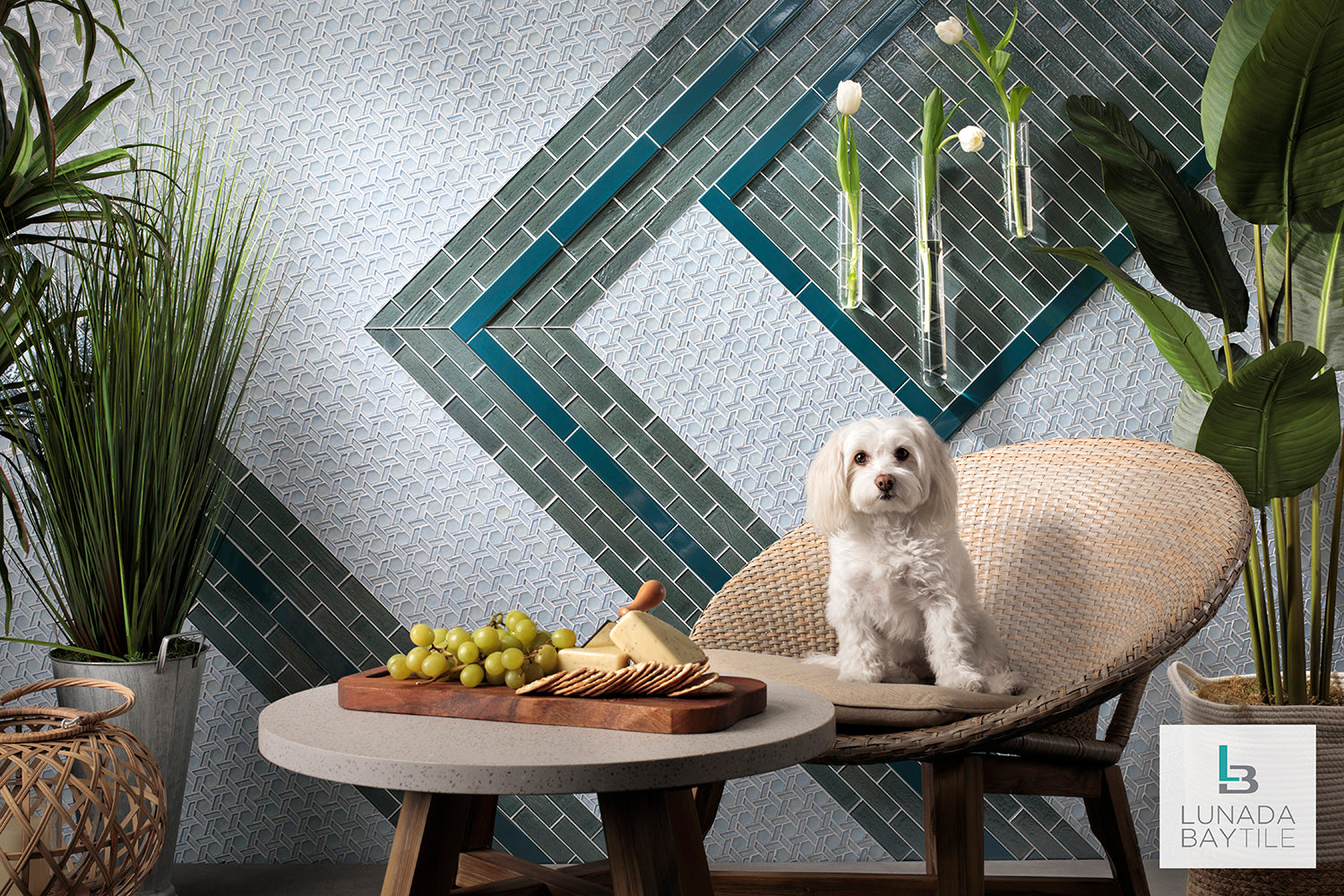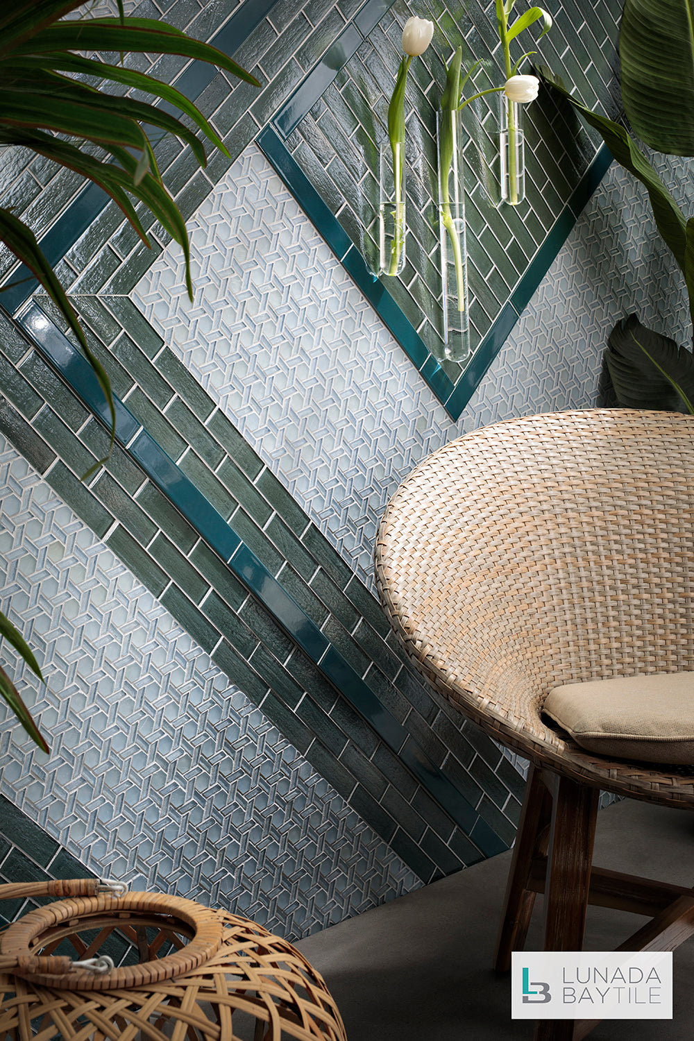 Elements Cane H2O, 1x3 Seaweed Pearl & Ka-nu Cruise Blue Liner were used to create this feature wall.