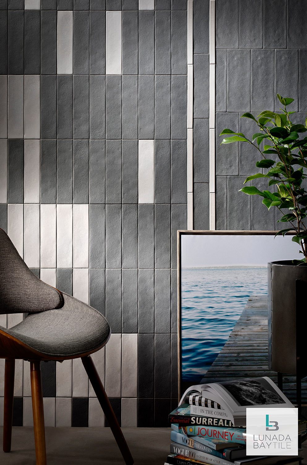 Graphic wall mixing pieces from two ceramic series: Graphite 2 ½ x 9 ½ and 3 ½ x 9 ½ in Black Iron with Shinju Smooth and Shinju Liners in Moonstone.