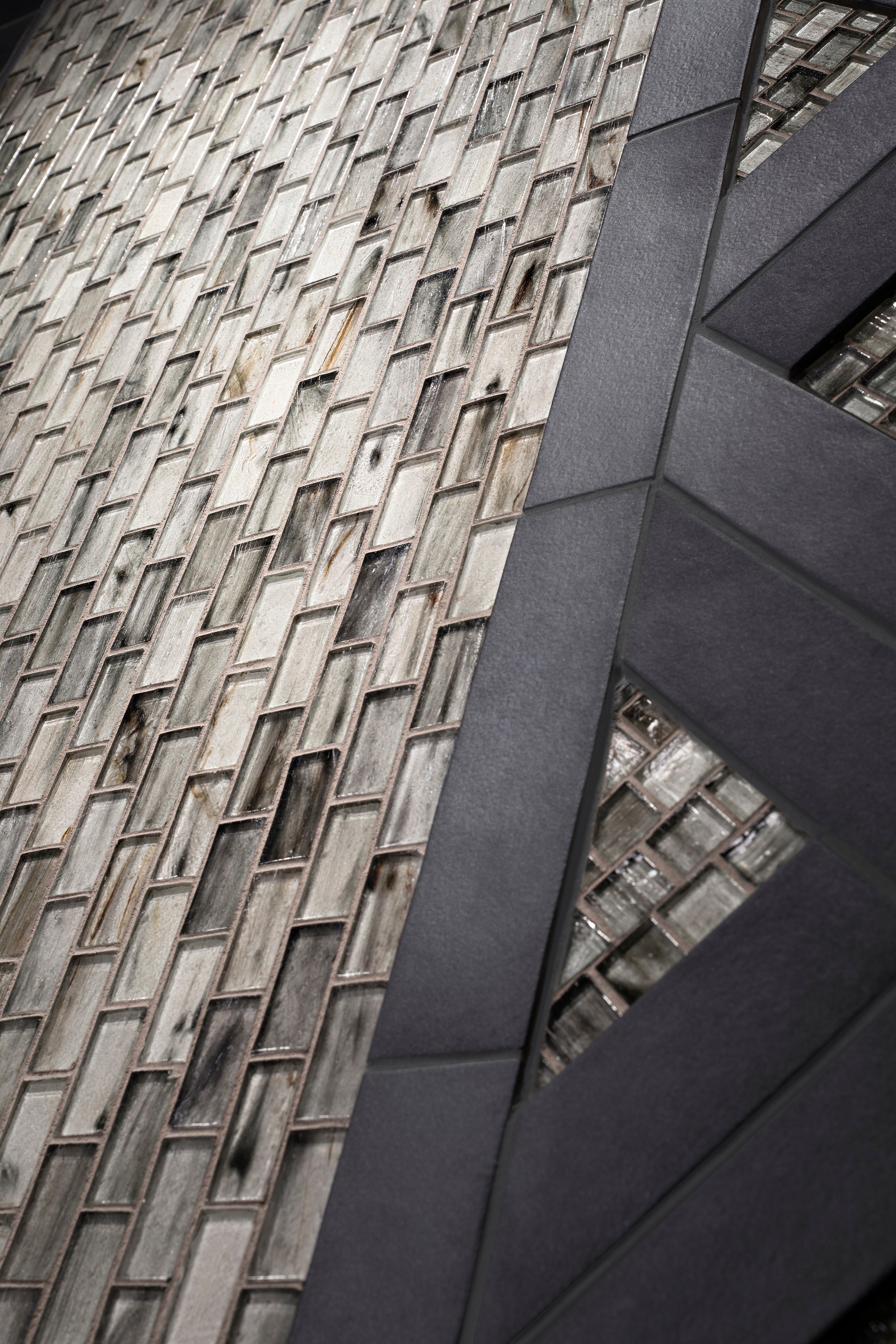 Haisen 1x1 Offset and 1x2 Brick in Starlight Natural with Graphite 2-1/2 x 9-1/2 creating the lattice pattern.