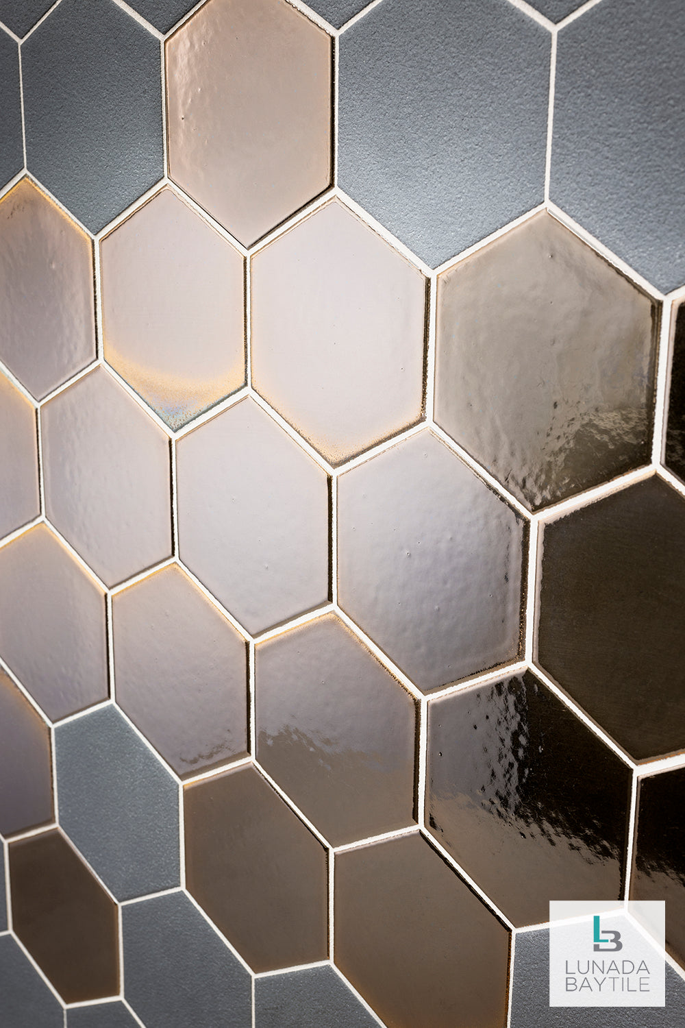 This ceramic tile backsplash exudes an energizing yet grounded blend of the Graphite 4" Hex in metallic Molten Bronze and matte Black Iron bring a great way to inspire the day.