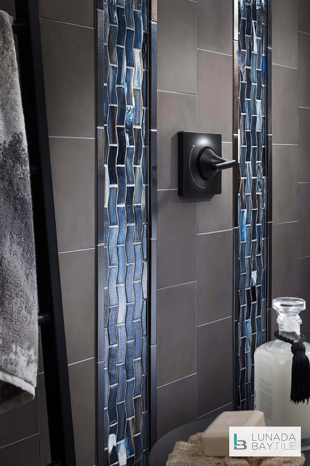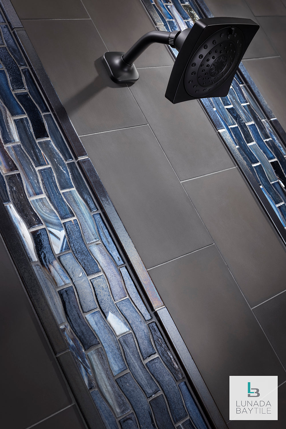 Glass mosaic border patterns create colorful and textural accents among the field of Contourz concrete tiles on this shower wall. Seen: JAW (Just Add Water) Zing 1x3 Border in Abruzzo, Contourz 6x9 in Irony, with Shinju Liners in Olympia.