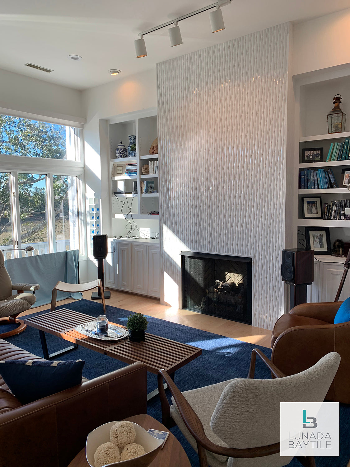 The dimensional, hand-crafted ceramic tiles from our Ka-nū series add a sophisticated layer of texture to this fireplace. Color: Sail, high-fired and glossy glaze.