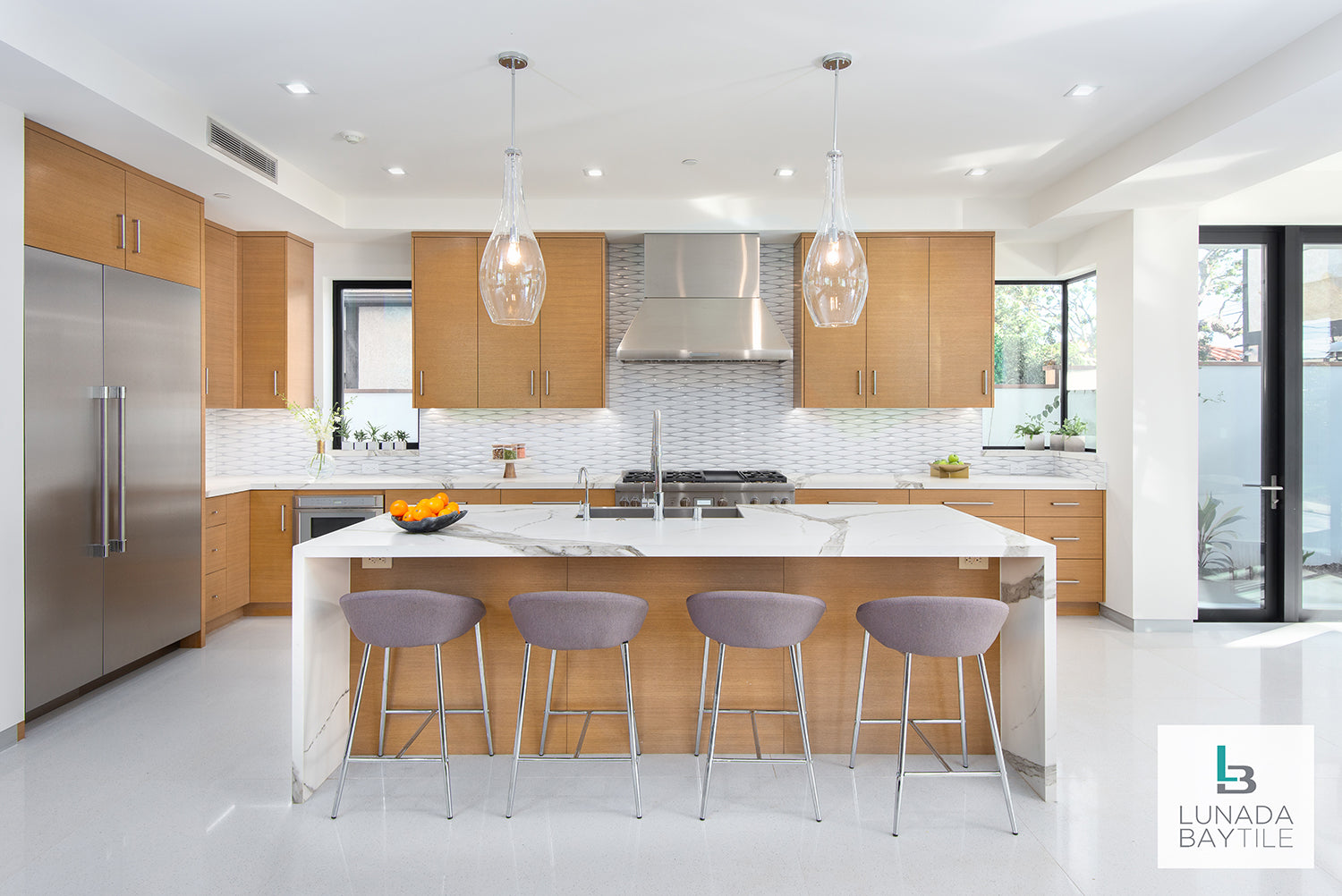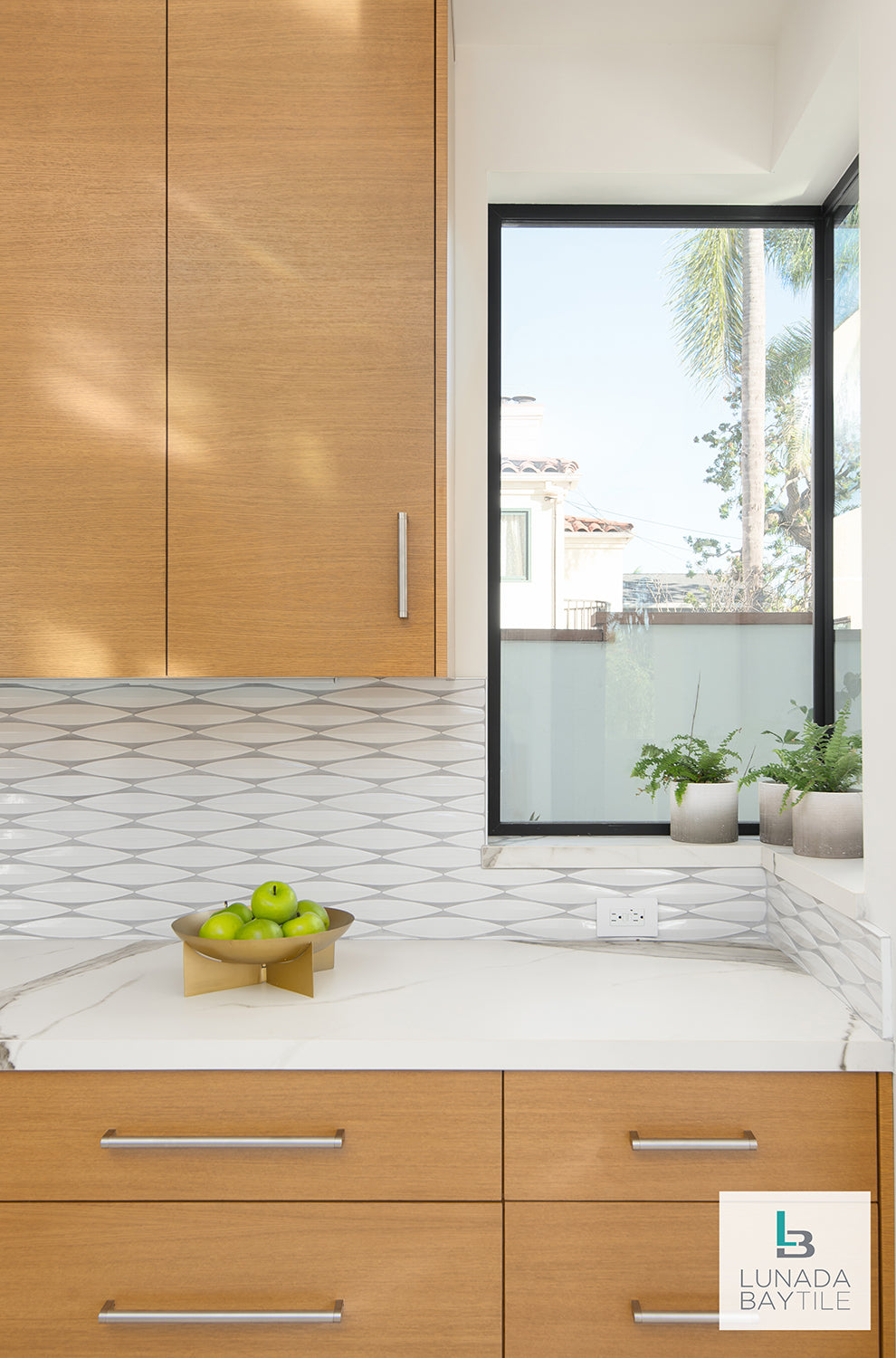 The crisp white, high-fired, glossy glaze adds brightness to the room in the dimensional, hand-crafted Keel shape adds an engaging layer of texture to this kitchen backsplash.
