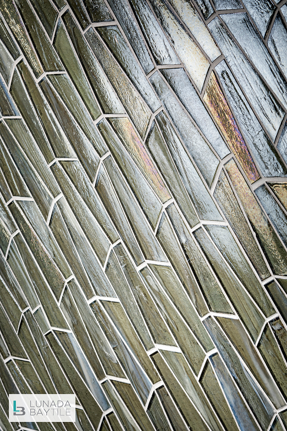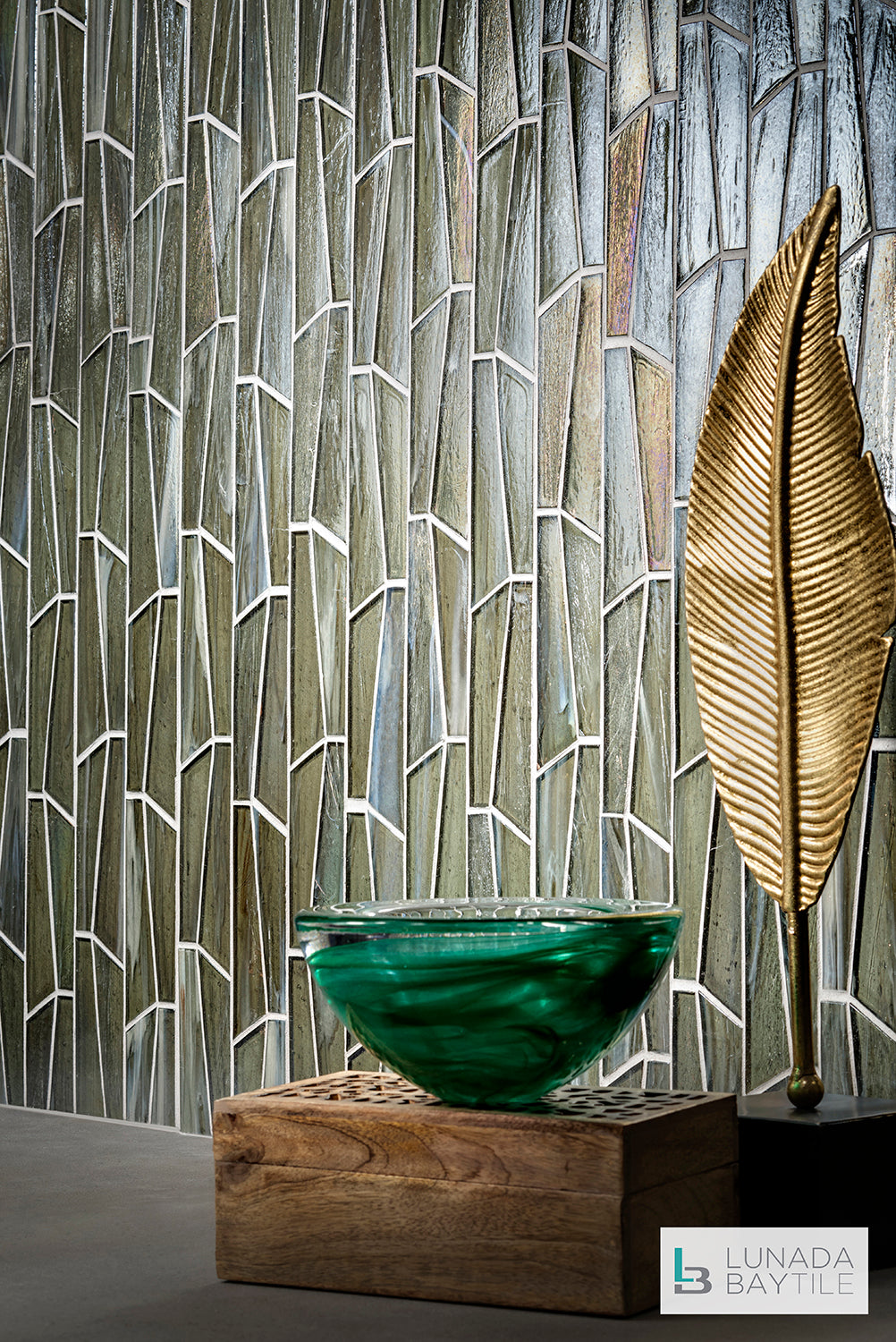 Exotic feeling and nature-inspired tiles in our patented Fin mosaic pattern from the Luce series create a warm and charming space. Seen here in the Mettle color and iridescent Pearl finish.