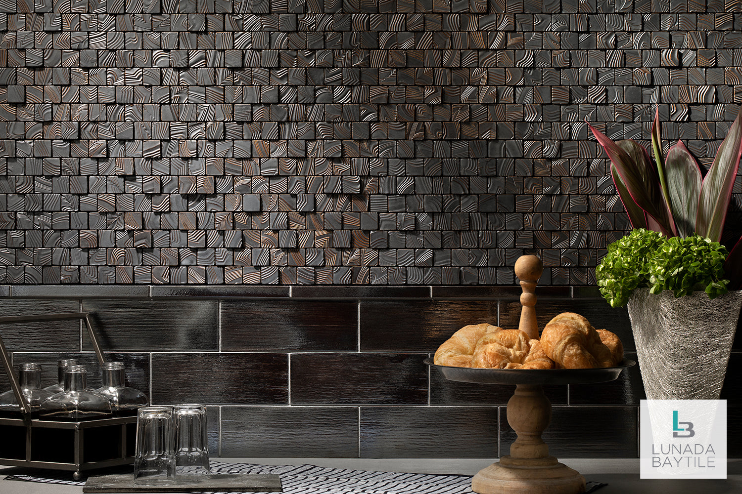 The tiles created at Lunada Bay Tile are designed to work alone or combined with any of our tile series for endless opportunities for your personal design. Here, Namibia Square Ripples in Dark Silver and Shinju Mirai Zen Garden in Olympia, with Shinju Liner, create a space that is rich and vibrant while feeling calm and grounded.