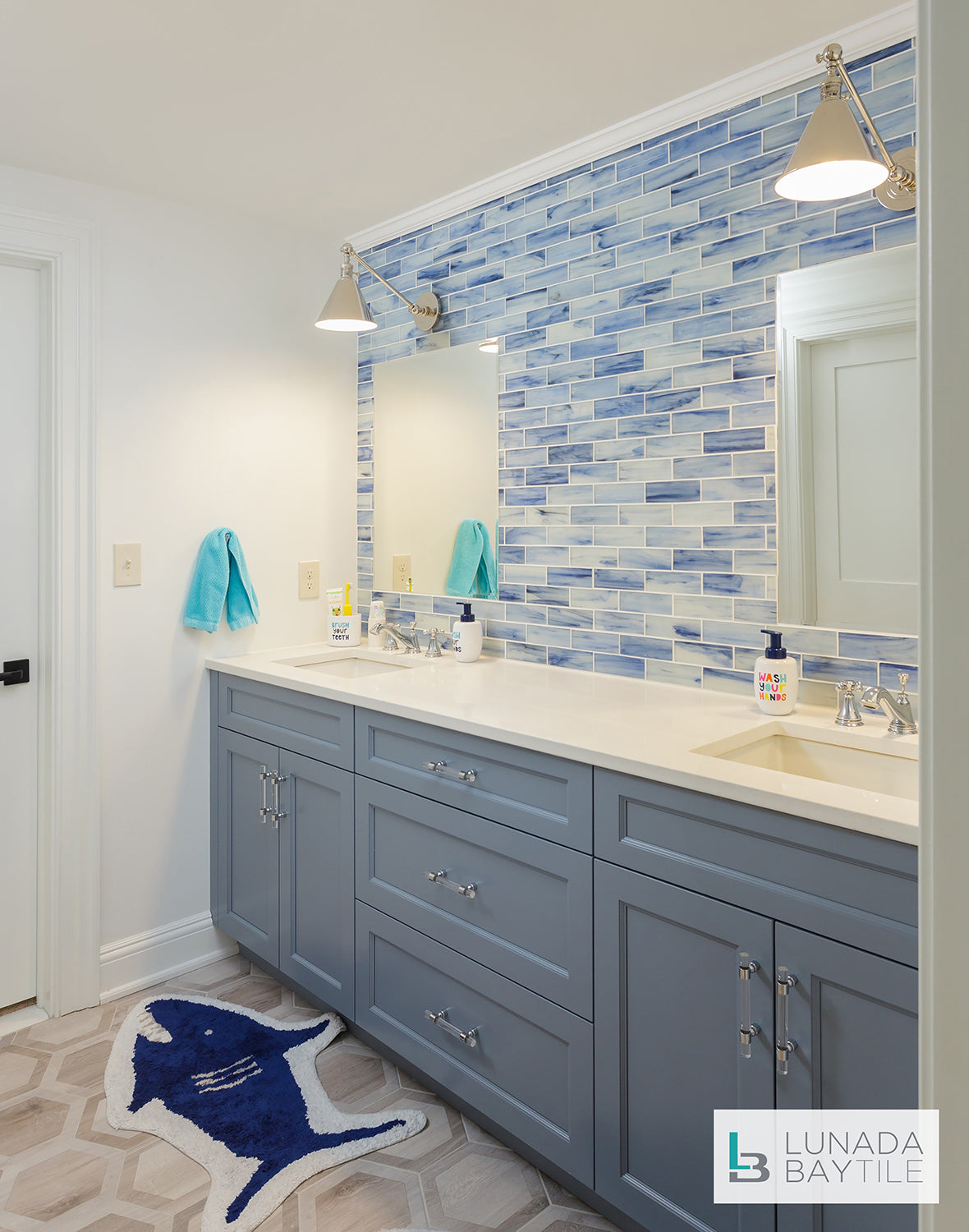 Inspiration Gallery / Ocean-themed bathroom Tozen Ocean-themed bathroom Bathroom Tozen 2x6 Antimony Silk on bathroom wall. Find a showroom Finish Silk Size Name 2 x 6 Color Antimony View Product PrevNext