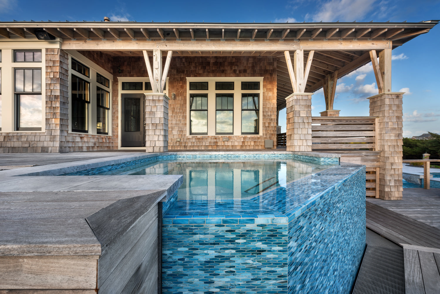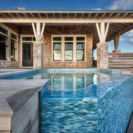 Whether you're taking a refreshing dip or lounging by the water, this enchanting retreat is a true celebration of nature’s artistry! The beautiful hand-crafted glass mosaics from our Agate series covering this pool and spa breathe life into this outdoor space. A delightful dance of blues and soft greys swirls within the glass perfectly capture the essence of coastal living by echoing the vibrant colors of the nearby ocean waters and the sky’s reflections on the pool's surface. Nestled throughout this Outer Banks, North Carolina home, the glass tiles harmonize beautifully with their nature-inspired colors and finishes, creating a serene oasis that invites you to relax, unwind, and soak in the beauty of the surroundings.