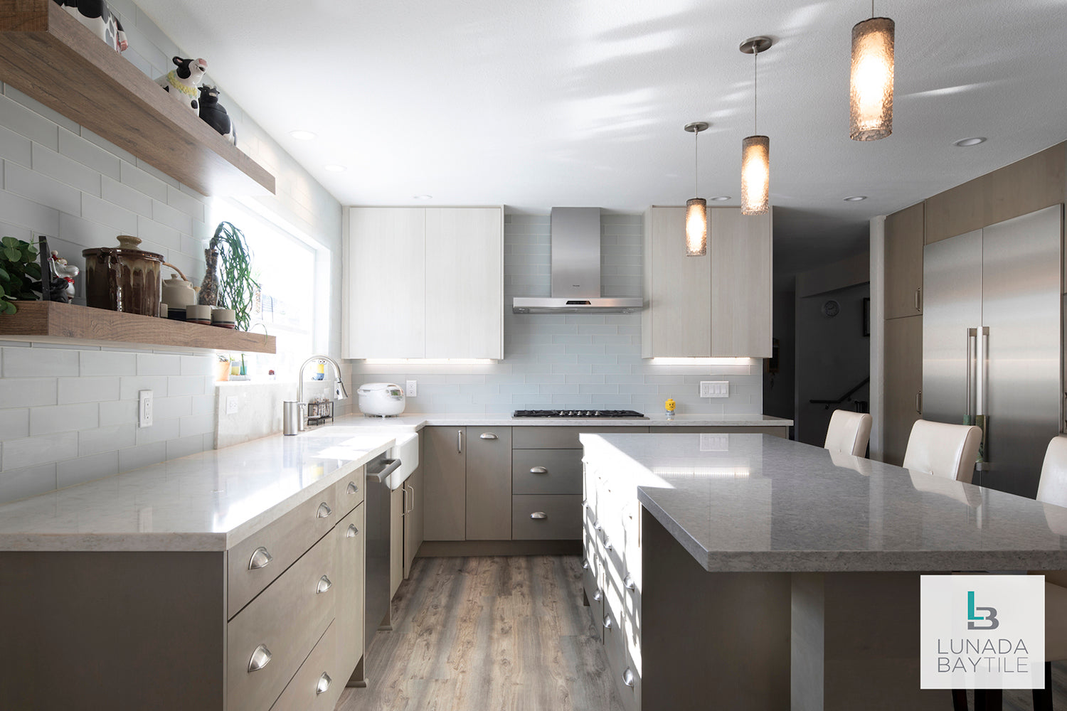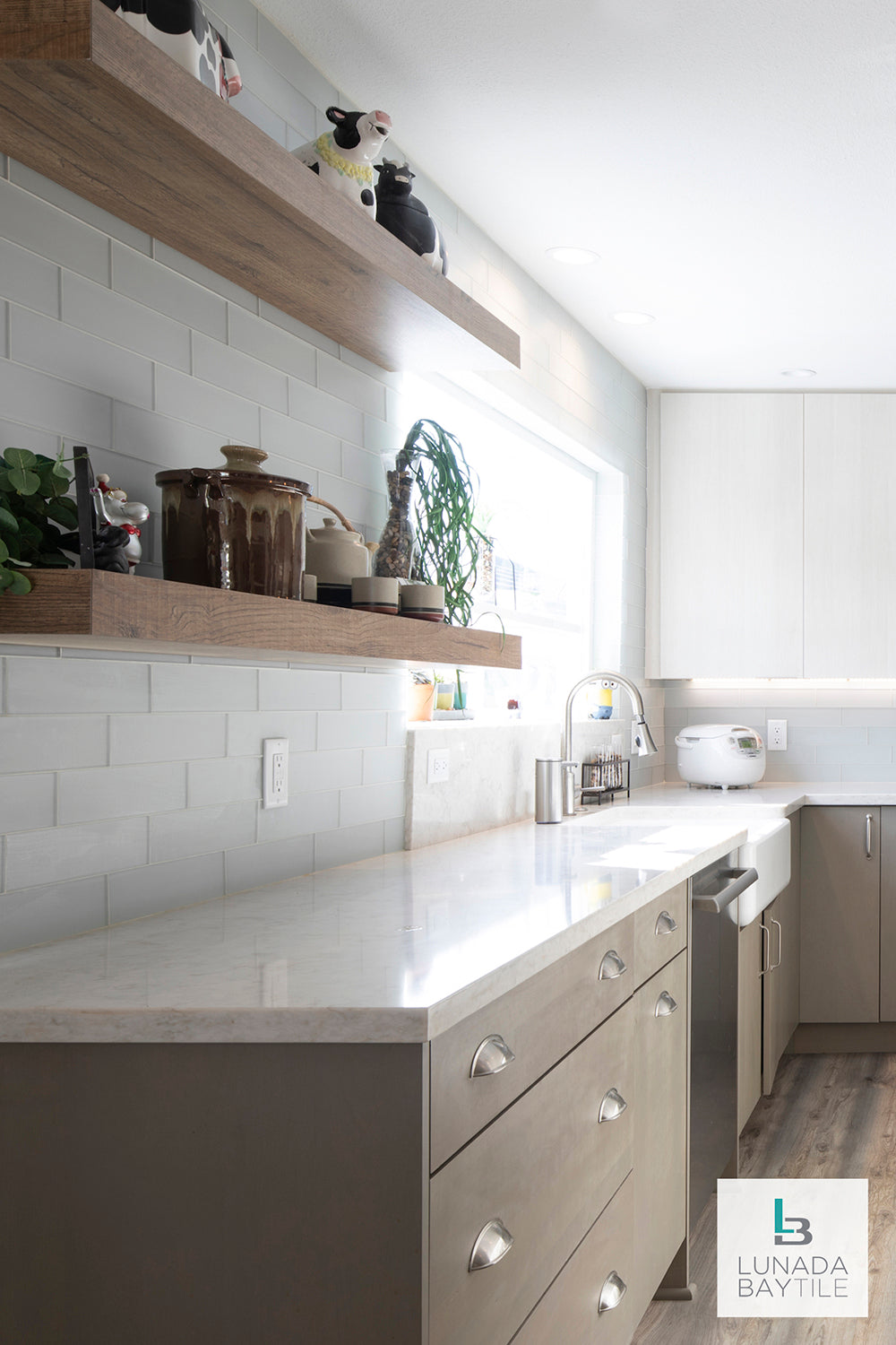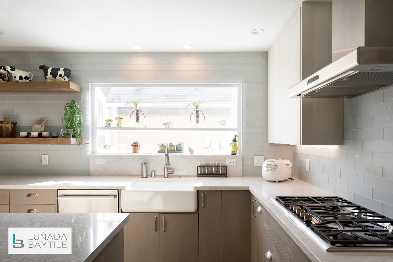 Tomei glass tiles covering the kitchen walls bring a sense of serenity and the Natural finish reflects light, making the space feel even more open.