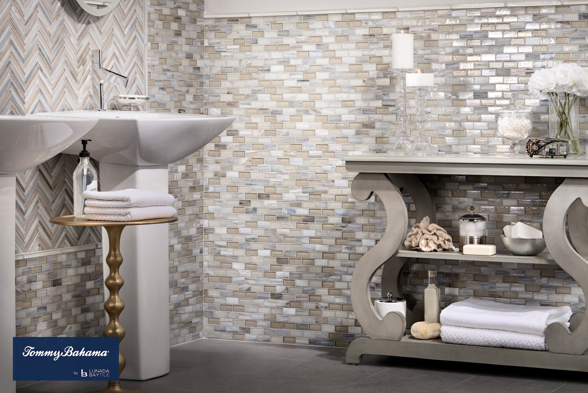 This elegant bathroom installation of Tommy Bahama® Glass Blends is sophisticated, yet earthy and unpretentious. Glass mosaics in 1x2 Brick and Zig & Zag patterns in the Cappadocia inspired colorway.