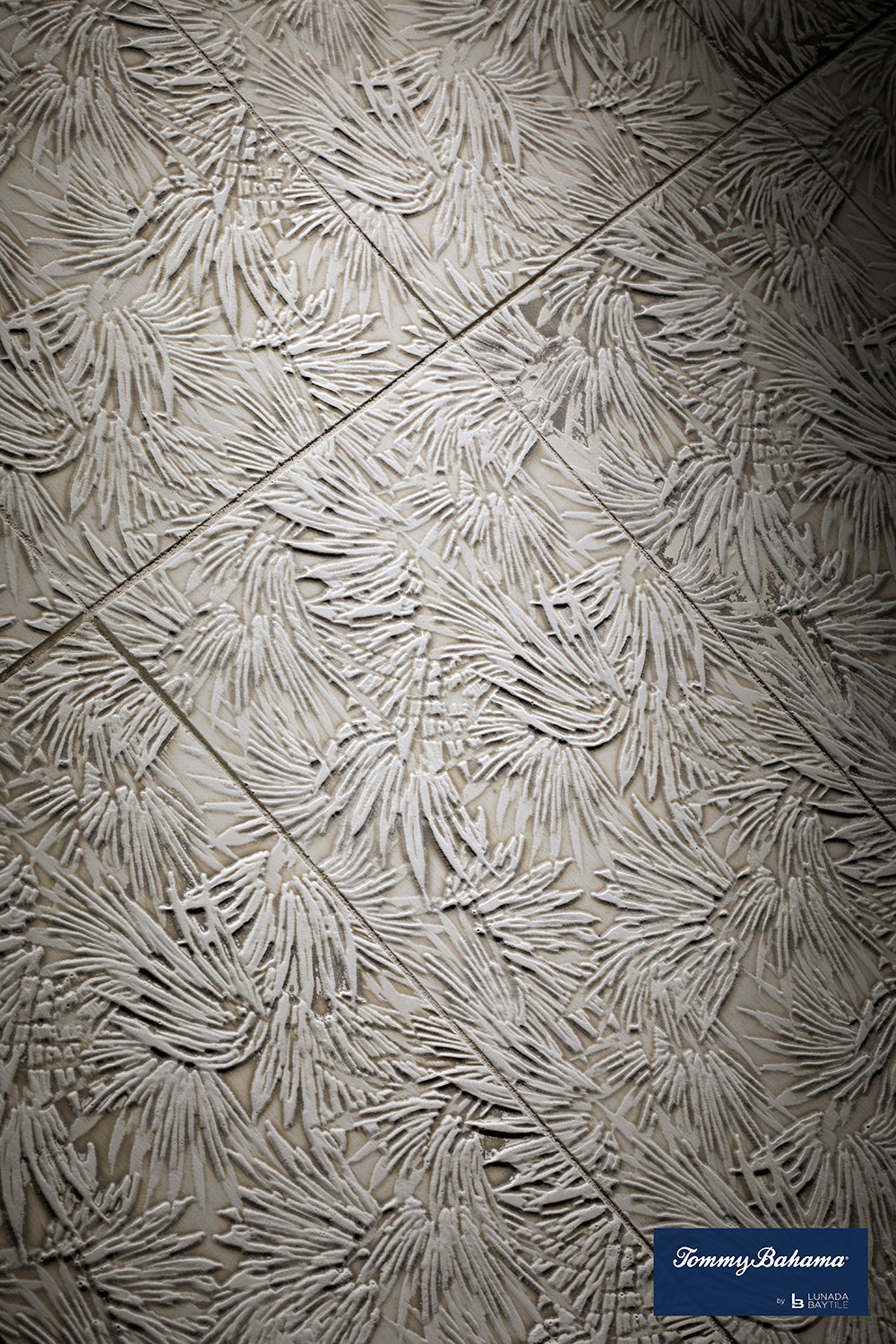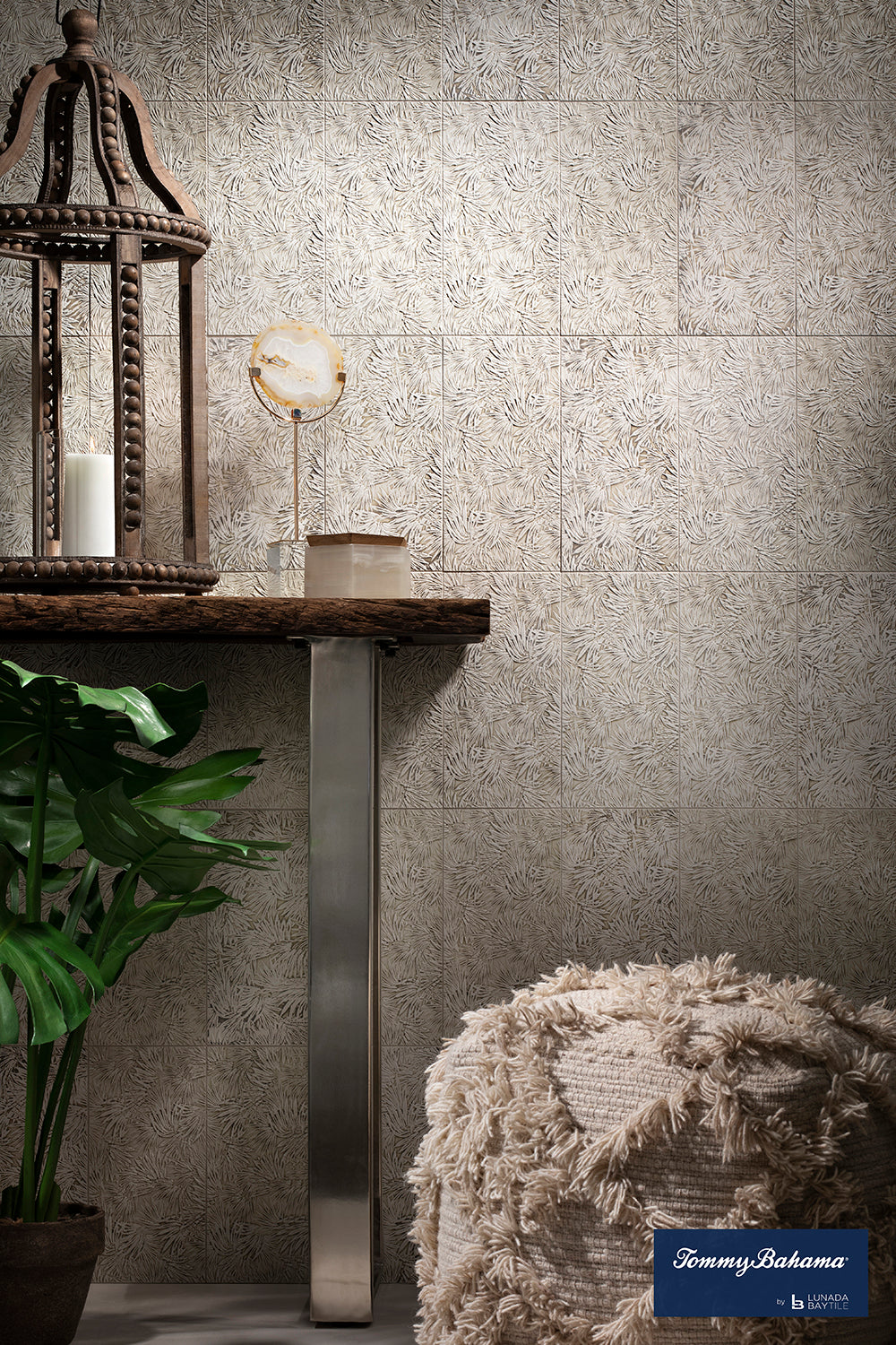Reinterpreting Tommy Bahama's most iconic textile prints, Kapa concrete tiles are inspired by elements of the exotic: sumptuous tropical fabrics, lush palm fronds, and waves lapping along a quiet shoreline. The embossed relief surfaces spark vacation daydreams and sanguine memories. Handcrafted in California, the dimensional surfaces add subtle, luxe texture to walls and coordinate with Tommy Bahama and Lunada Bay Tile glass collections.