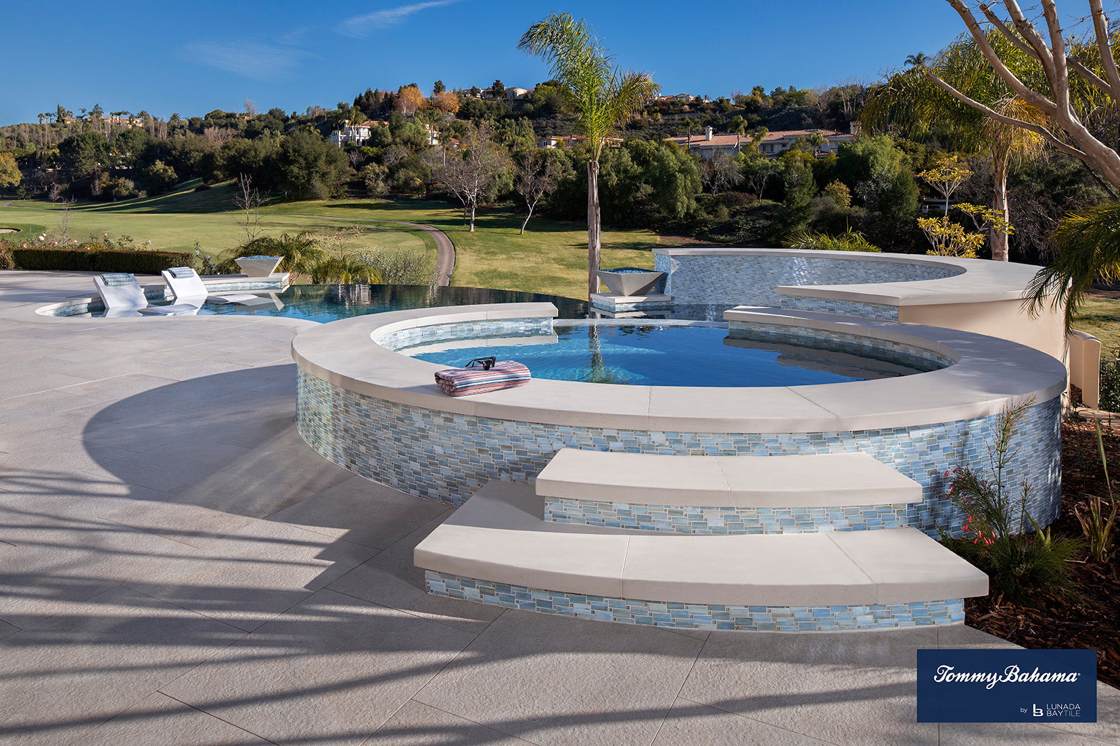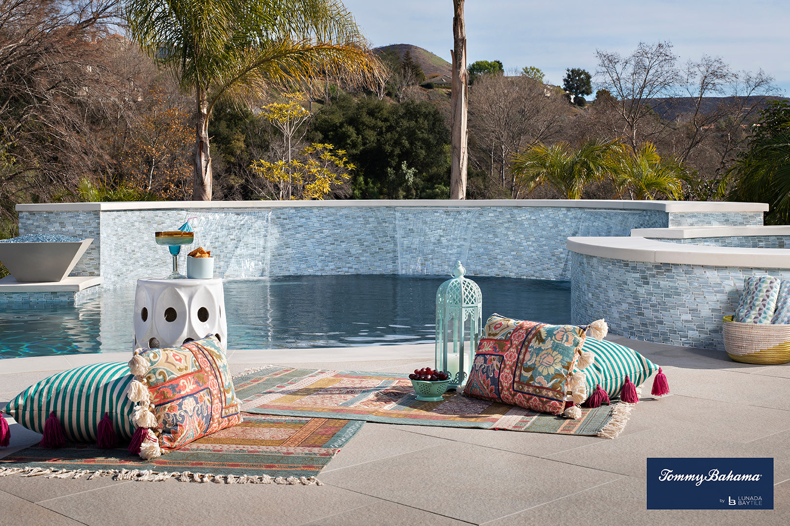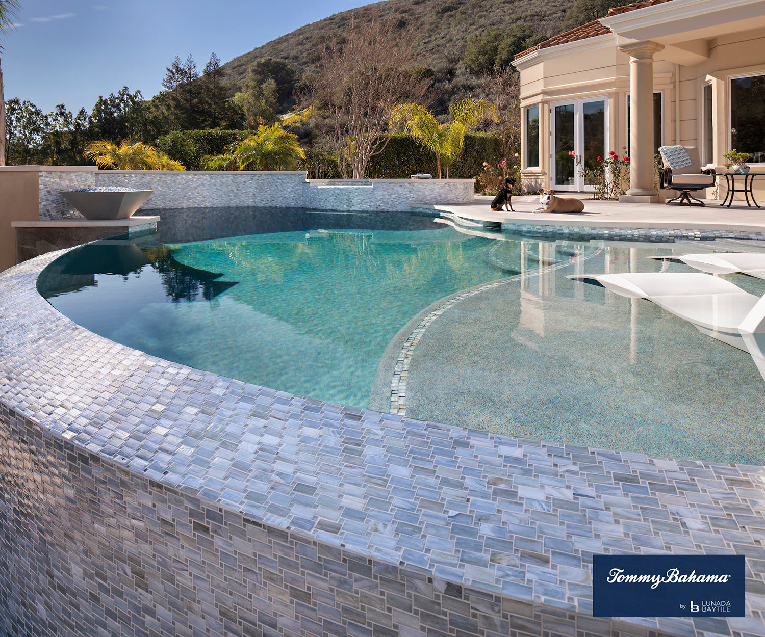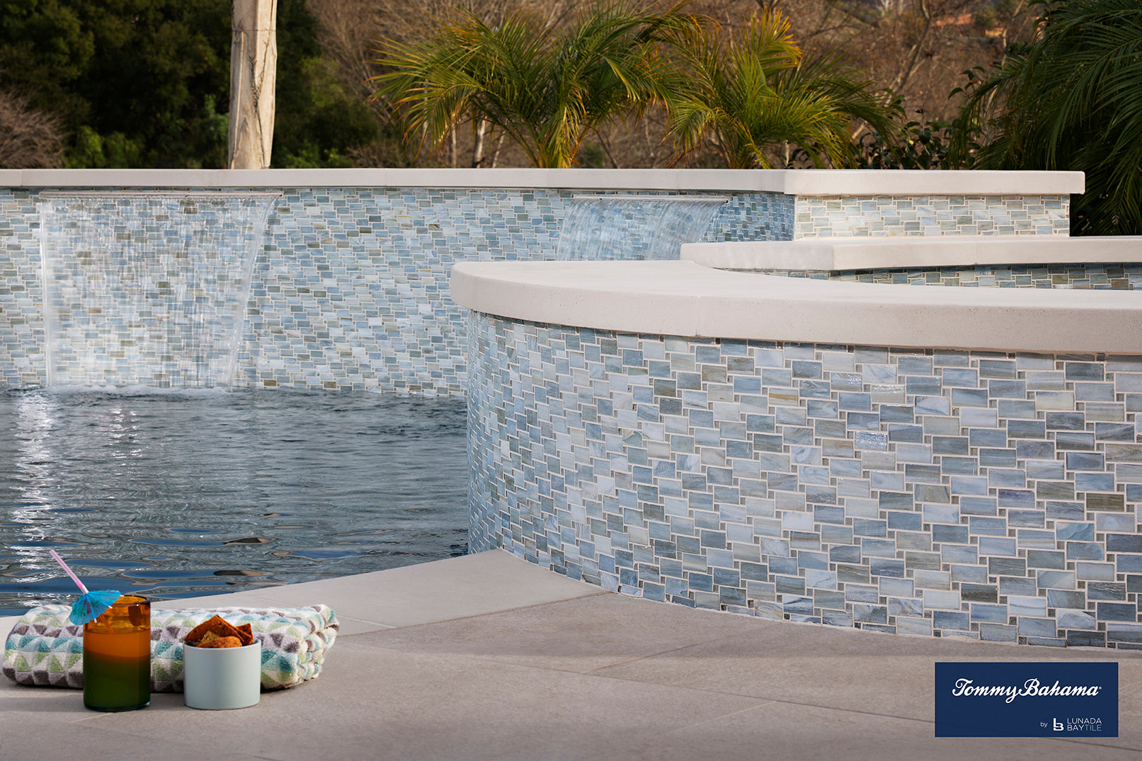 Lunada Bay Tile’s glass mosaic tile introduces a “wow factor” to outdoor installations. Pool designers can draw from a plethora of patterns, colors and sizes to create a stunning bespoke environment. Not only are glass tiles beautiful, the product is qualified for chlorine, salt, or saline chlorinated pools. Glass tiles do not fade, warp, or need high maintenance. The tiles are smooth to the touch and can be used on the pool floor and walls.