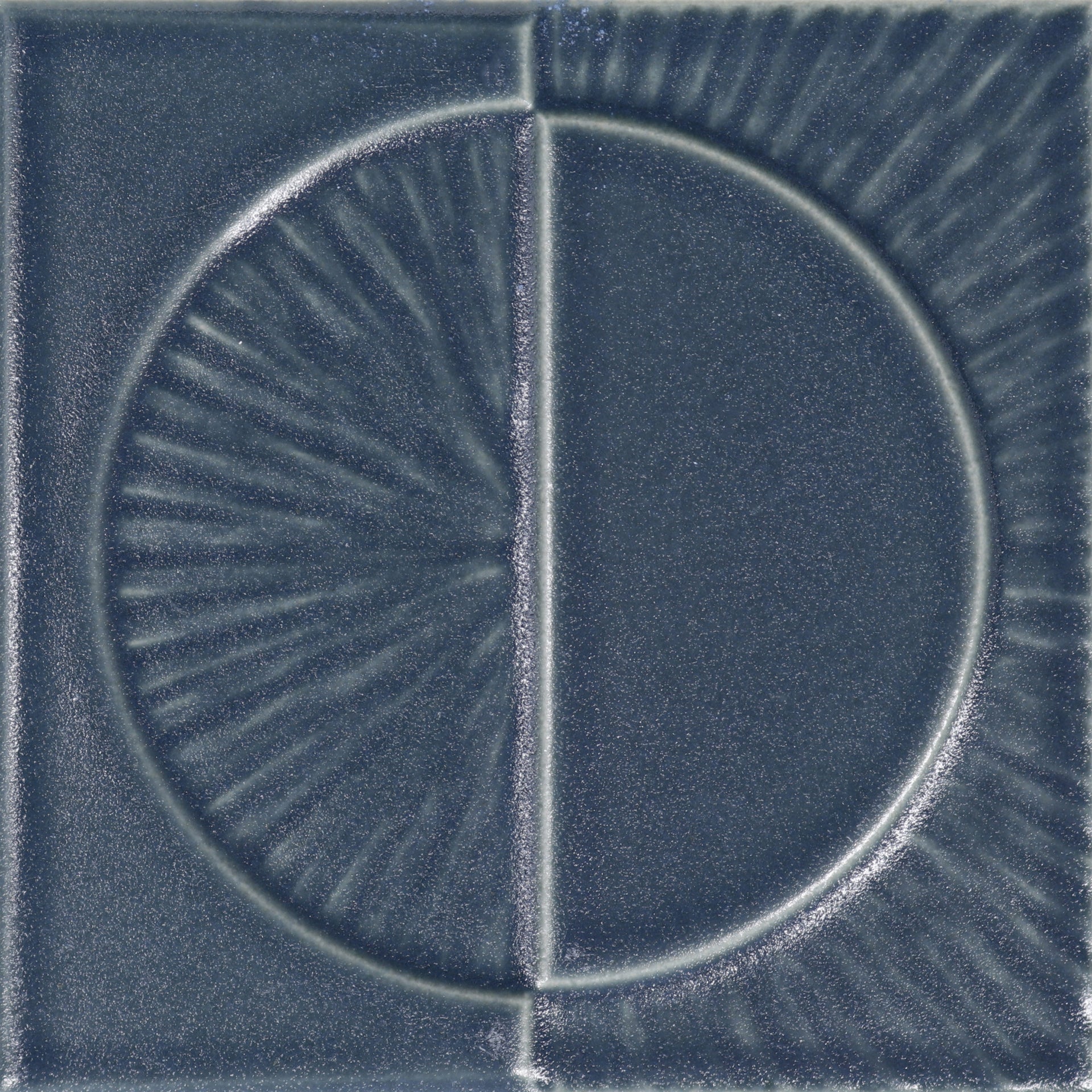 Hand-crafted ceramic tile with a mix between a sunburst and mid-century geometric motif features semi-circles in an alternating variation of hand-sculpted texture and three-dimensional relief.
